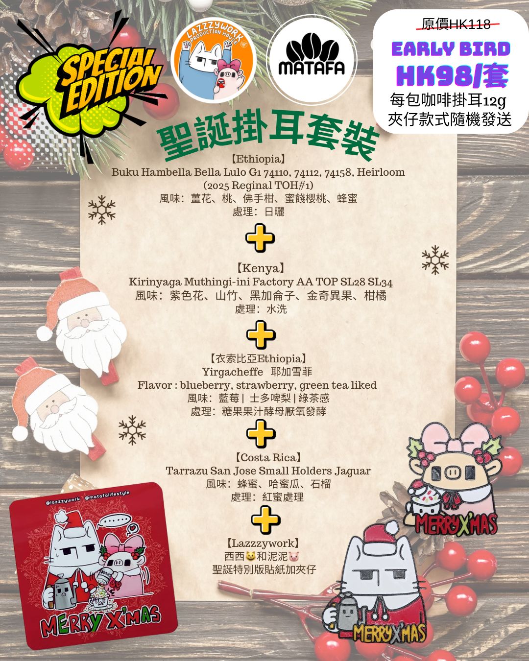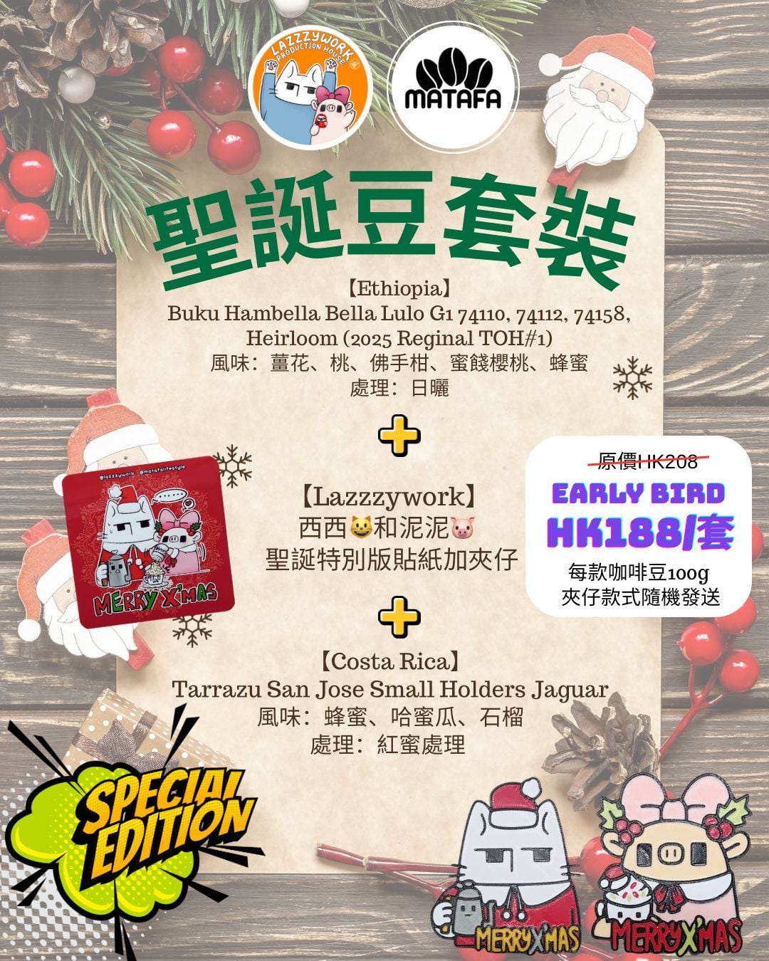 MATATAFA 聯乘 Lazzzywork 推出期間限定 Special Edition 聖誕套裝,以精品咖啡結合插畫設計,打造最有節日氣氛的味覺禮物 🎄。 兩款套裝可選,送禮、自用、交換禮物都十分合適! 🎁 套裝內容(選擇「聖誕豆套裝」) 每款咖啡豆 100g ① Ethiopia|Buku Hambella Bella Lulo G1(2025 Reginal TOH/#1) 風味:薑花、桃、佛手柑、蜜餞櫻桃、蜂蜜 處理:日曬 ② Costa Rica|Tarrazu San Jose Small Holders Jaguar 風味:蜂蜜、哈密瓜、石榴 處理:紅蜜處理 ③ Lazzzywork 聖誕限定貼紙+夾仔 西西貓🐱 & 和泥泥🐷 聖誕特別插畫(隨機款式) 🎁 套裝內容(選擇「聖誕掛耳套裝」時) 每包掛耳 12g ① Ethiopia|Buku Hambella Bella Lulo G1 風味:薑花、桃、佛手柑、蜜餞櫻桃、蜂蜜 處理:日曬 ② Kenya|Kirinyaga Muthingini Factory AA TOP SL28 SL34 風味:紫花、山竹、黑加侖子、金奇異果、柑橘 處理:水洗 ③ Ethiopia|Yirgacheffe 耶加雪菲 風味:藍莓、士多啤梨、多重果感、綠茶感 處理:糖果果汁汁酵母氧氣發酵 ④ Costa Rica|Tarrazu San Jose Jaguar 風味:蜂蜜、哈密瓜、石榴 處理:紅蜜處理 ⑤ Lazzzywork 聖誕限定貼紙+夾仔 西西貓🐱 & 和泥泥🐷 聖誕特別插畫(隨機款式)