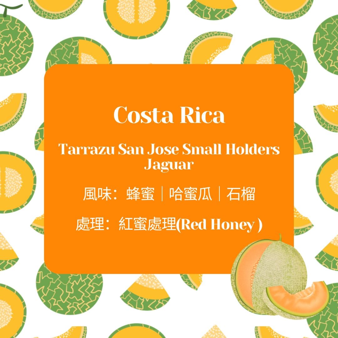 【Costa Rica】 Tarrazu San Jose Small Holders Jaguar 塔拉珠 聖荷西小農 美洲虎 Flavor: honey, hami melon, pomegranate 風味:蜂蜜、哈蜜瓜、石榴 處理:紅蜜處理(Red Honey ) 烘焙日期:26 Nov 2025 💎100g 豆加$20轉 8包掛耳(每包掛耳淨重12g)或 5包冷泡包(每包淨重20g)