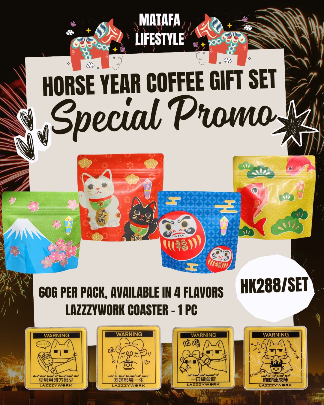 Matafa Lifestyle 為你準備咗呢個超有層次的 四種風味咖啡豆套裝(每款60g)+ 隨機一款 LAZZZYWORK 經典杯墊(咖啡鍊成陣 / 豆到用時方恨少 / 索啡影響一生 / 一口續命啡)